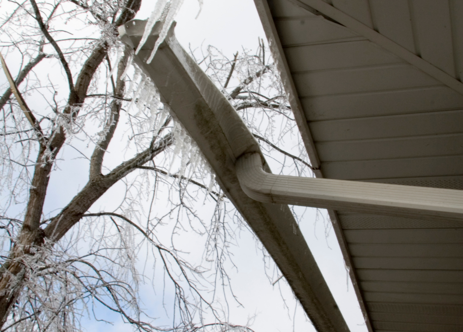 One of the most common winter problems is water freezing inside the gutter system. Even a small amount of trapped water can expand into solid ice overnight. Once that happens, meltwater has nowhere to go and is forced back toward the roof or down the side of the home.